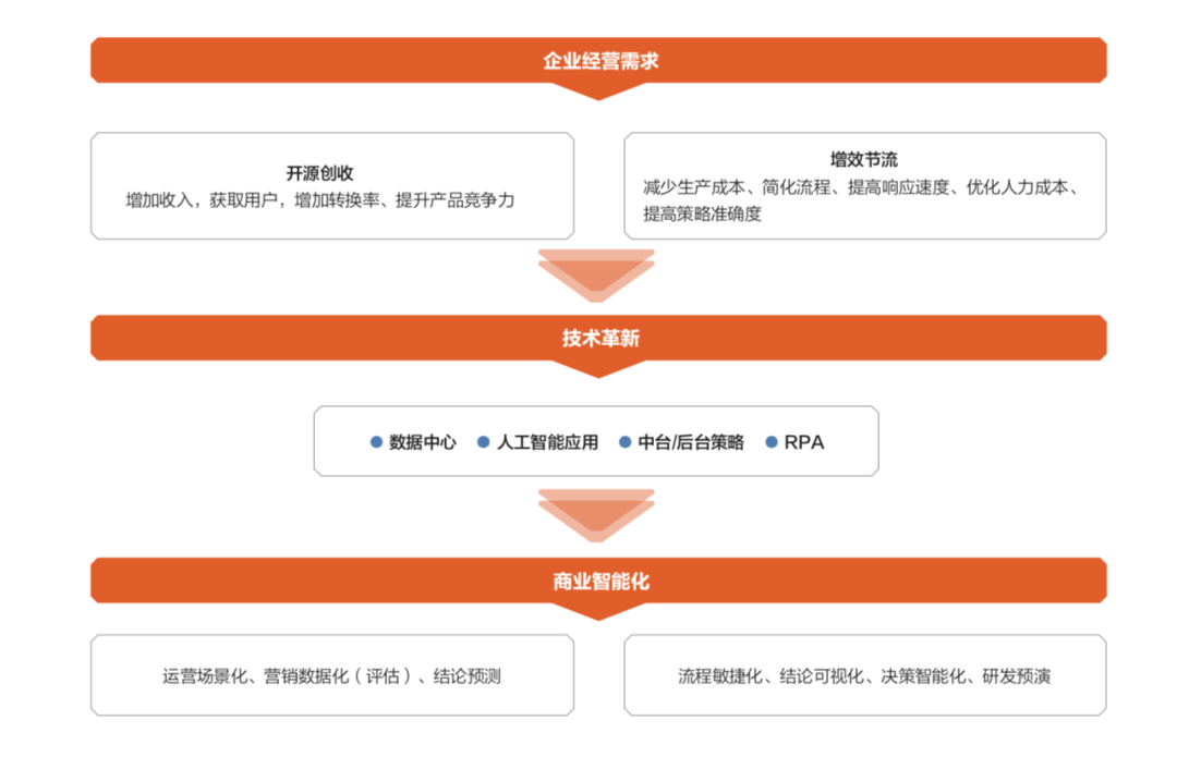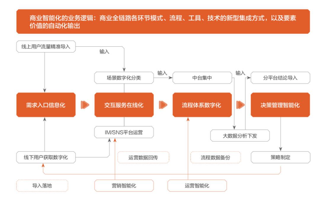 具體來說,智能商業(yè)化是利用各種數(shù)據(jù)體系與新型的系統(tǒng)工具(大數(shù)據(jù)、RPA、運籌學、機器學習)優(yōu)化了原有的商業(yè)運營通路,將松散信息流與運營集中化管理輸出,從而實現(xiàn)需求入口信息化、交互服務在線化、流程體系數(shù)字化,決策管理智能化。
