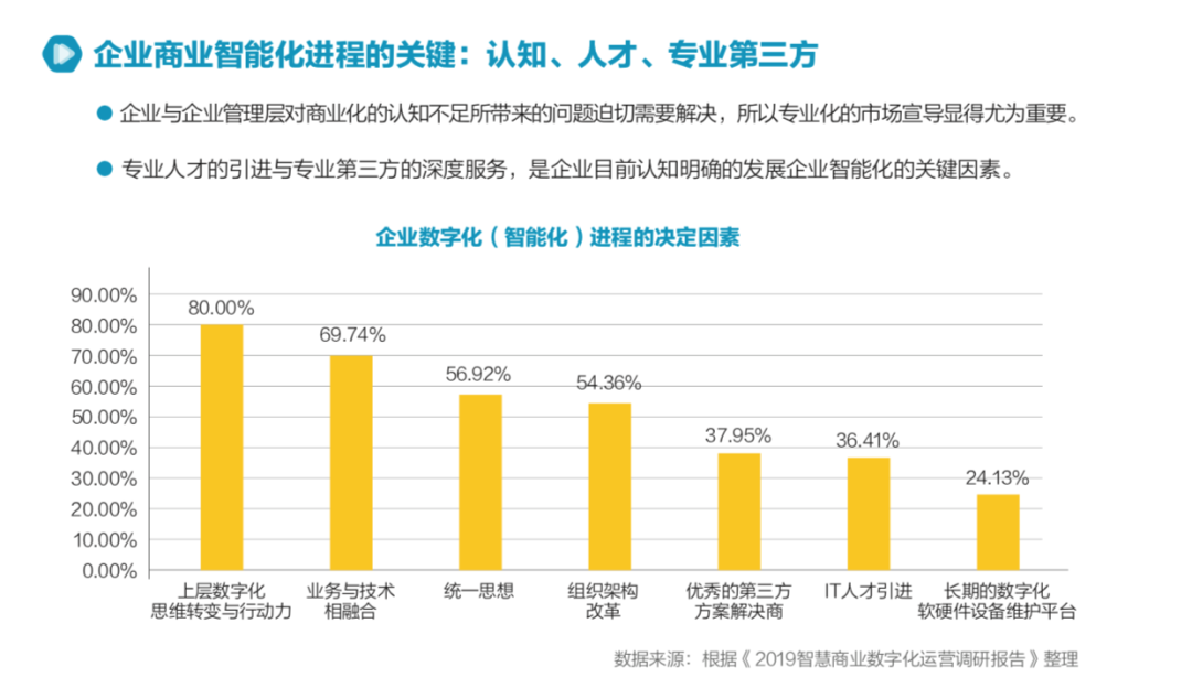在專業(yè)人才與相關(guān)知識儲備方面,則需要第三方深度智能化服務商的引入,創(chuàng)業(yè)邦與眾盟科技聯(lián)合發(fā)布的《2020中國商業(yè)智能化發(fā)展研究報告》也強調(diào)這是現(xiàn)階段中小企業(yè)進行企業(yè)智能化發(fā)展的關(guān)鍵。