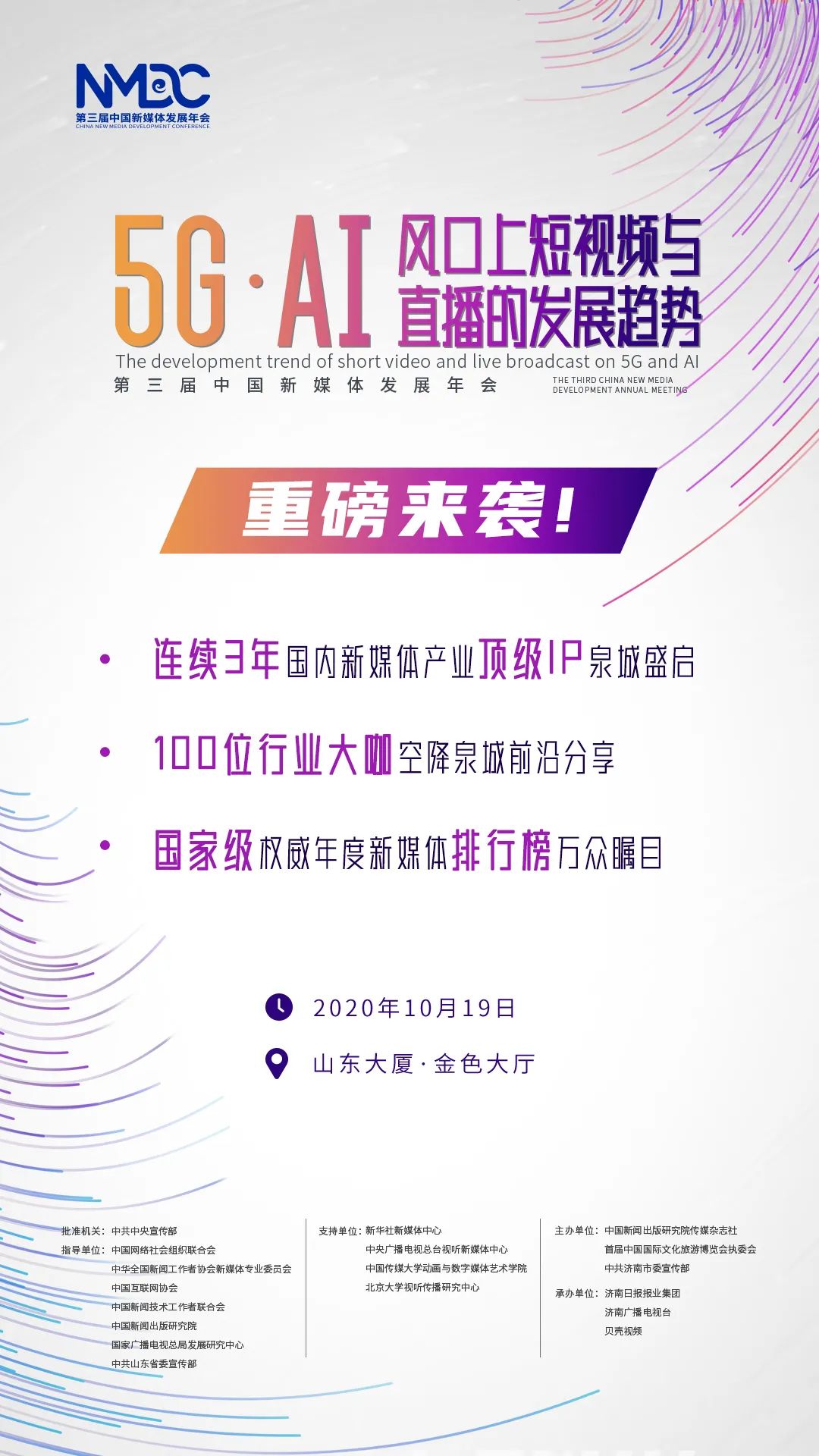 經(jīng)中共中央宣傳部批準(zhǔn),中國新聞出版研究院傳媒雜志社聯(lián)合中共濟(jì)南市委宣傳部,在成功舉辦了兩屆年會的基礎(chǔ)上,將于2020年10月19日在濟(jì)南市舉辦第三屆中國新媒體發(fā)展年會,學(xué)習(xí)和貫徹今年6月30日中辦、國辦印發(fā)的《關(guān)于加快推進(jìn)媒體深度融合發(fā)展的意見》精神,分享與交流短視頻與直播的發(fā)展經(jīng)驗(yàn),研判問題,探討趨勢,共謀發(fā)展。