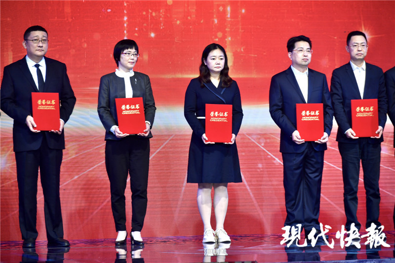 △現(xiàn)代快報社編委孫蘭蘭(中)上臺領(lǐng)獎